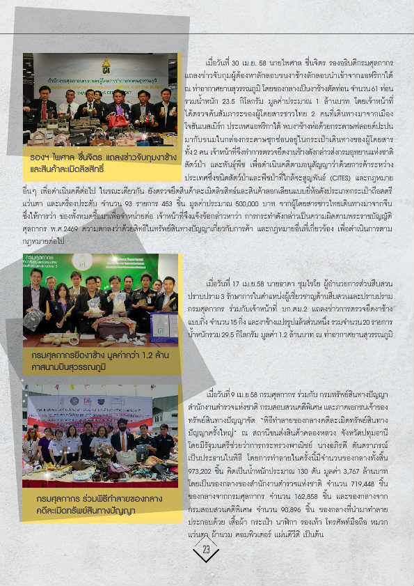 คดลี ะเมิดทรัพย์สินทางปัญญา แบบกง่ิ จำ� นวน15 กงิ่ และงาชา้ งแปรรปู แลว้ สว่ นหนงึ่ รวมจำ� นวน20 รายการ