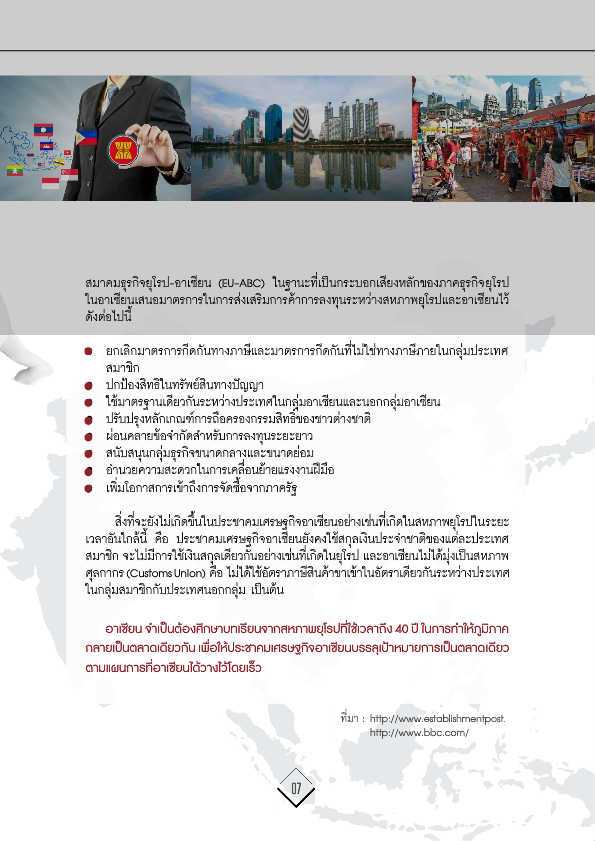 อาเซียน จ�ำเปน็ ต้องศกึ ษาบทเรยี นจากสหภาพยโุ รปที่ใชเ้ วลาถึง 40 ปี ในการทำ� ใหภ้ ูมิภาค