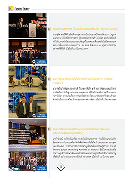 นายกลุ ศิ สมบตั ศิ ริ ิ อธบิ ดกี รมศลุ กากร เปน็ ประธานเปดิ งานสมั มนา “Digital Customs” เพื่อให้ส่วนราชการ ผู้ประกอบการนาเข้า ส่งออก และโลจิสติกส์ เขา้ ใจในการดา เนนิ งานและทราบขอ้ มลู ในภาพรวมดา้ นเทคโนโลยสี ารสนเทศ และการสื่อสารของกรมศุลกากร ณ ห้อง Ballroom A ศูนย์การประชุม แห่งชาติสิริกิติ์ เมื่อวันที่ 24 มีนาคม 2559