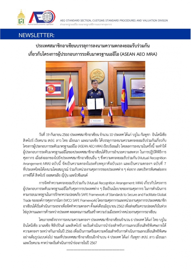 เมื่อวันที่ 19 กันยายน 2566 ประเทศสมาชิกอาเซียน จำนวน 10 ประเทศ ได้แก่ บรูไน กัมพูชา อินโดนีเซีย สิงคโปร์ เวียดนาม สปป. ลาว ไทย เมียนมา และมาเลเซีย ได้บรรลุการลงนามความตกลงยอมรับร่วมกันเกี่ยวกับโครงการผู้ประกอบการระดับมาตรฐานเออีโอ (ASEAN AEO MRA) เรียบร้อยแล้ว