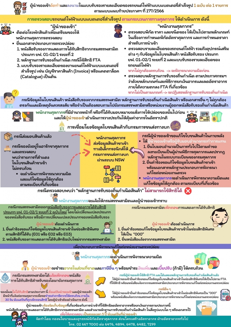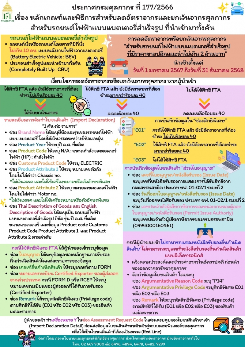 Infographic ประกาศกรมศุลกากร ที่ 177/2566 เรื่อง หลักเกณฑ์และพิธีการสำหรับการลดอัตราอากรและยกเว้นอากรศุลกากรสำหรับรถยนต์ไฟฟ้าแบบแบตเตอรี่สำเร็จรูปที่นำเข้ามาทั้งคัน