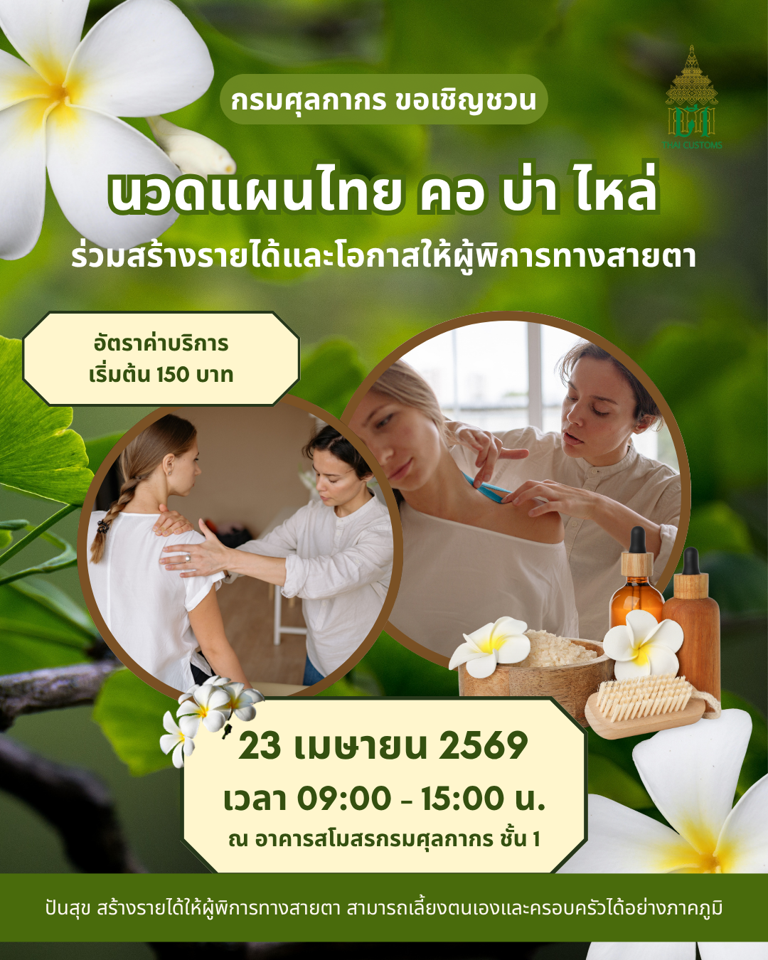 กรมศุลกากร ขอเชิญชวนนวดแผนไทย คอ บ่า ไหล่ ร่วมสร้างรายได้และโอกาสให้ผู้พิการทางสายตา