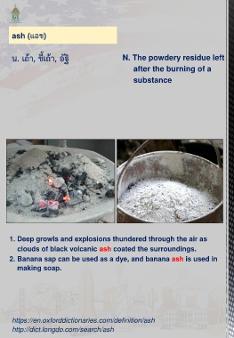 น. เถ้า, ขี้เถ้า, อัฐิ N. The powdery residue left