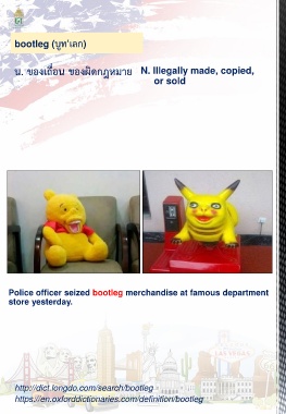 bootleg (บูท'เลก) น. ของเถื่อน ของผิดกฎหมาย N. Illegally made, copied, or sold Police officer seized bootleg merchandise at famous department store yesterday. http://dict.longdo.com/search/bootleg https://en.oxforddictionaries.com/definition/bootleg