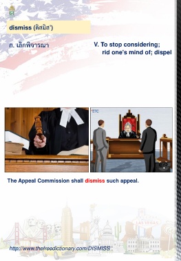 dismiss (ดิสมิส') ก. เลิกพิจารณา V. To stop considering; rid one's mind of; dispel The Appeal Commission shall dismiss such appeal. http://www.thefreedictionary.com/DISMISS