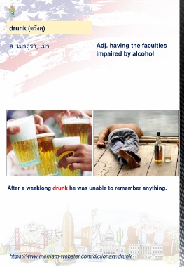 drunk (ดรังคฺ) ค. เมาสุรา, เมา Adj. having the faculties impaired by alcohol After a weeklong drunk he was unable to remember anything. https://www.merriam-webster.com/dictionary/drunk