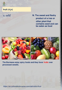 fruit (ฟรูท) น. ผลไม้ N. The sweet and fleshy product of a tree or other plant that contains seed and can be eaten as food The Burmese enjoy spicy foods and they favor fruits over processed sweets. https://en.oxforddictionaries.com/definition/fruit