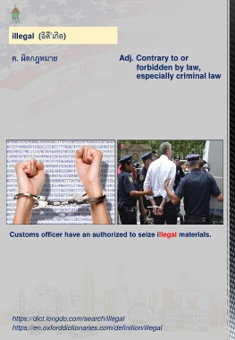 illegal (อิลี'เกิล) ค. ผิดกฎหมาย Adj. Contrary to or forbidden by law, especially criminal law Customs officer have an authorized to seize illegal materials. https://dict.longdo.com/search/illegal https://en.oxforddictionaries.com/definition/illegal
