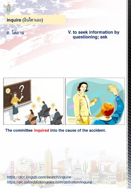 inquire (อินไควเอะ) ก. ไต่ถาม V. to seek information by questioning; ask The committee inquired into the cause of the accident. https://dict.longdo.com/search/inquire https://en.oxforddictionaries.com/definition/inquire