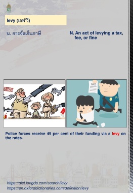 levy (เลฟ'วี) น. การจัดเก็บภาษี N. An act of levying a tax, fee, or fine Police forces receive 49 per cent of their funding via a levy on the rates. https://dict.longdo.com/search/levy https://en.oxforddictionaries.com/definition/levy