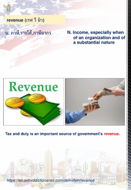 revenue (เรฟ วึ นิว) น. ภาษี,รายได้,ภาษีอากร N. Income, especially when of an organization and of a substantial nature Tax and duty is an important source of government's revenue. https://en.oxforddictionaries.com/definition/revenue