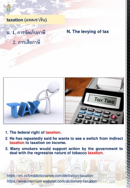 น. 1. การจัดเก็บภาษี N. The levying of tax