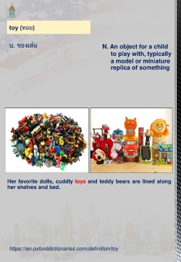 toy (ทอย) น. ของเล่น N. An object for a child to play with, typically a model or miniature replica of something Her favorite dolls, cuddly toys and teddy bears are lined along her shelves and bed. https://en.oxforddictionaries.com/definition/toy